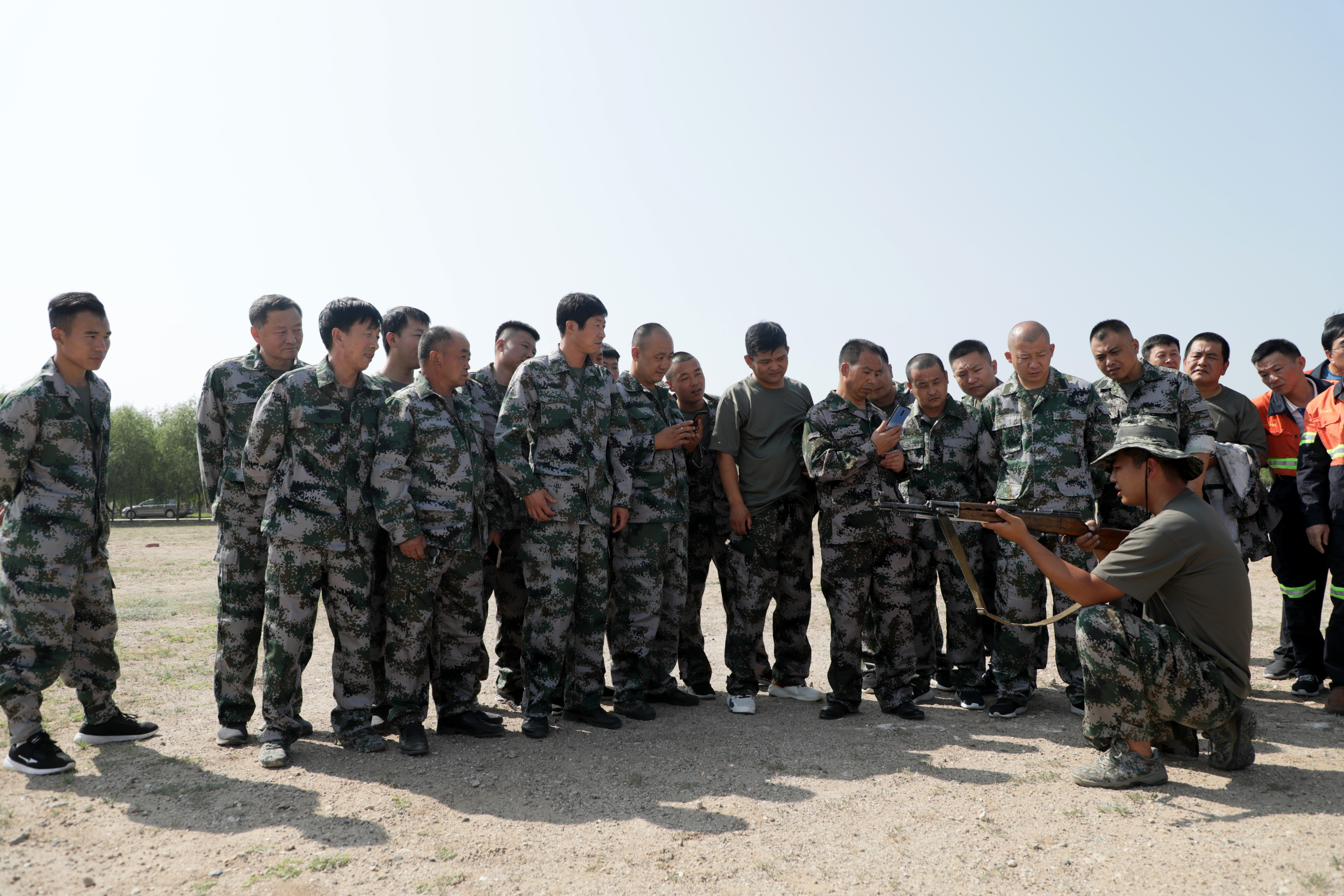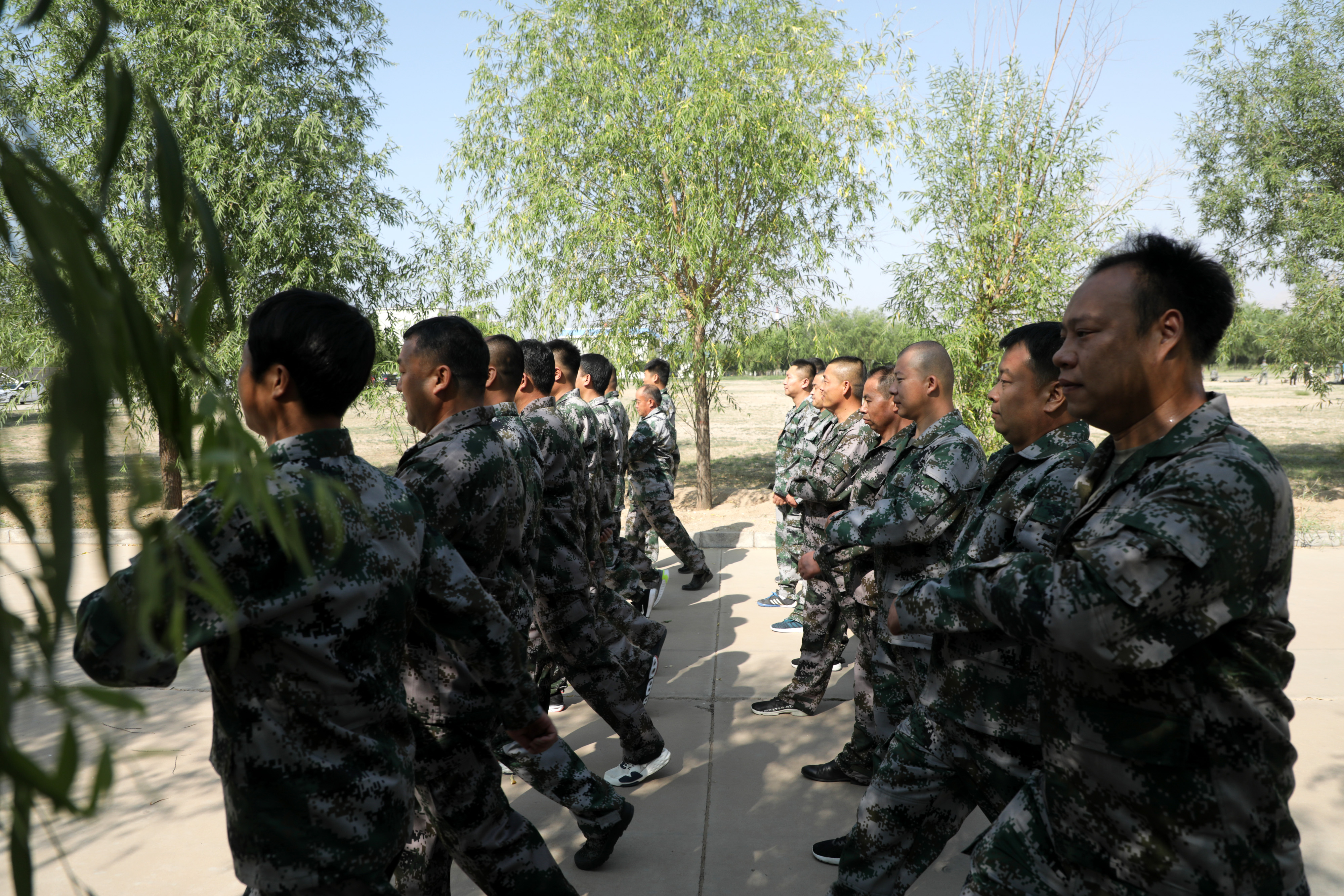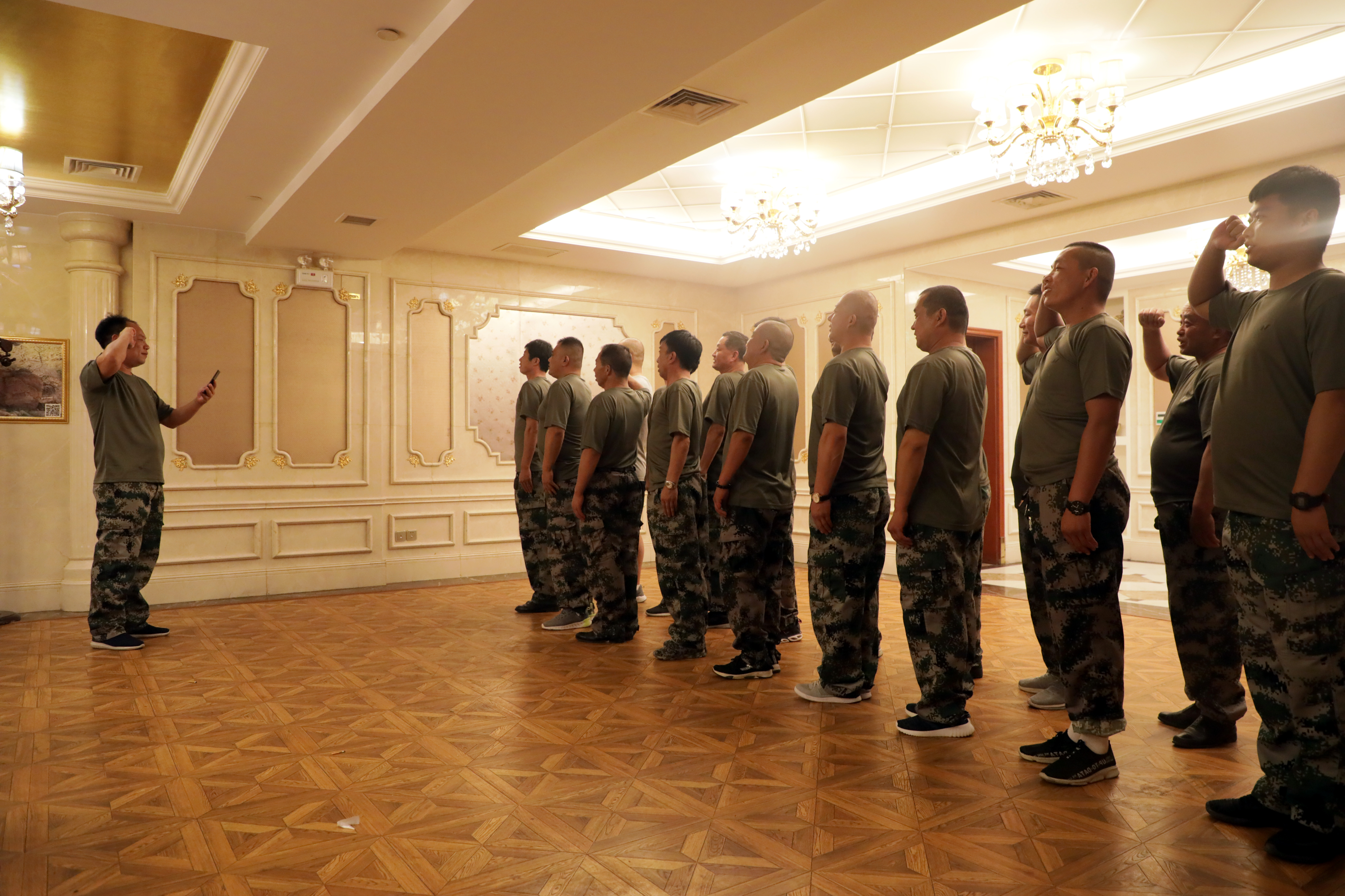 在军事队列训练过程中队员们虽然表现出了久未训练的生疏,但通过几轮训练后逐步进入状态,站起了挺拔的军姿、踢起了铿锵的正步,展现出退伍军人应有的风采。