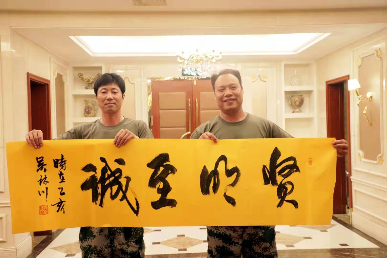 吴林川为打靶第一名获得者胡涛送上亲手书写的字幅